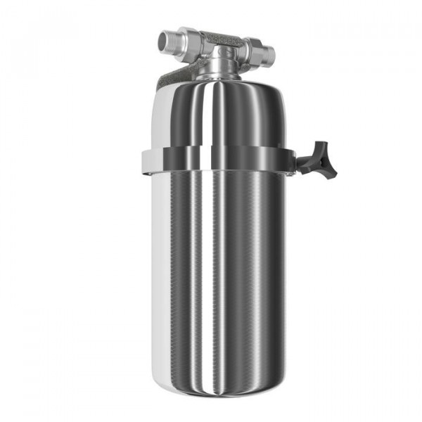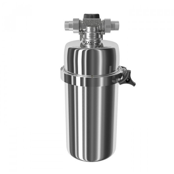 Магистральный фильтр среднего размера. Модель оснащена быстросъемным креплением «американка». Нижний полукорпус изготовлен из нержавеющей стали марки AISI 316, особенно устойчивой к коррозии и высоким температурам.